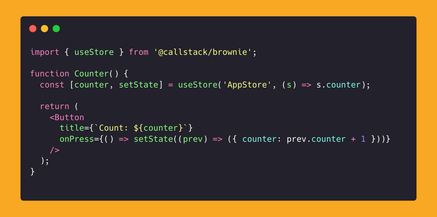 The key difference with Brownie is that the shared state lives on the native side and is exposed to JavaScript via JSI. You define and manage the shape of your store using a *.brownie.ts file: