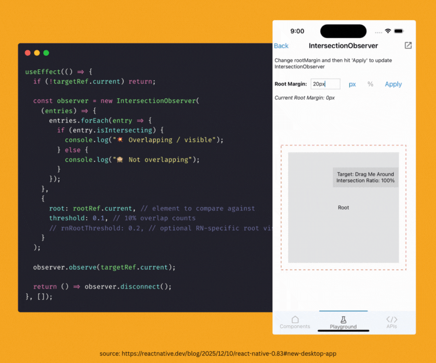 Yes, as we’ve been saying for the past year: React Native is becoming multi-platform. The latest addition is the Intersection Observer API. It lets you measure the “intersection” of elements—super useful for drag-and-drop interfaces that used to require a mess of complex logic to pull off.