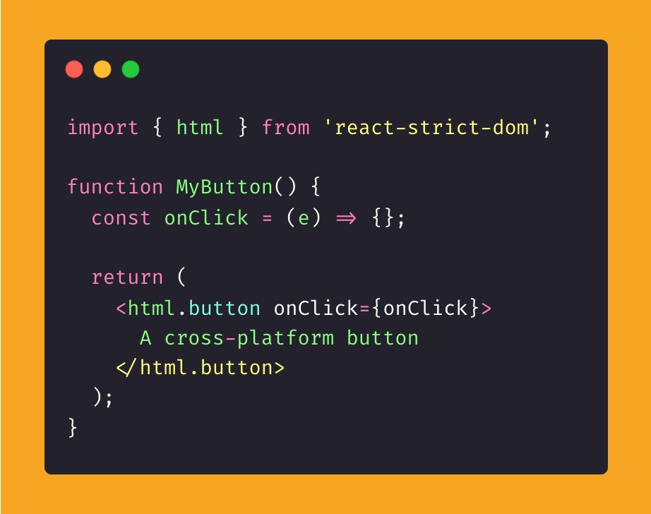 Now, React Strict DOM does the opposite: it allows you to write strict HTML and strict CSS. Essentially, it’s a library you install and set up. Meta (previously Facebook) used it to render components on both the web and native platforms. Here’s what the strict HTML API looks like: