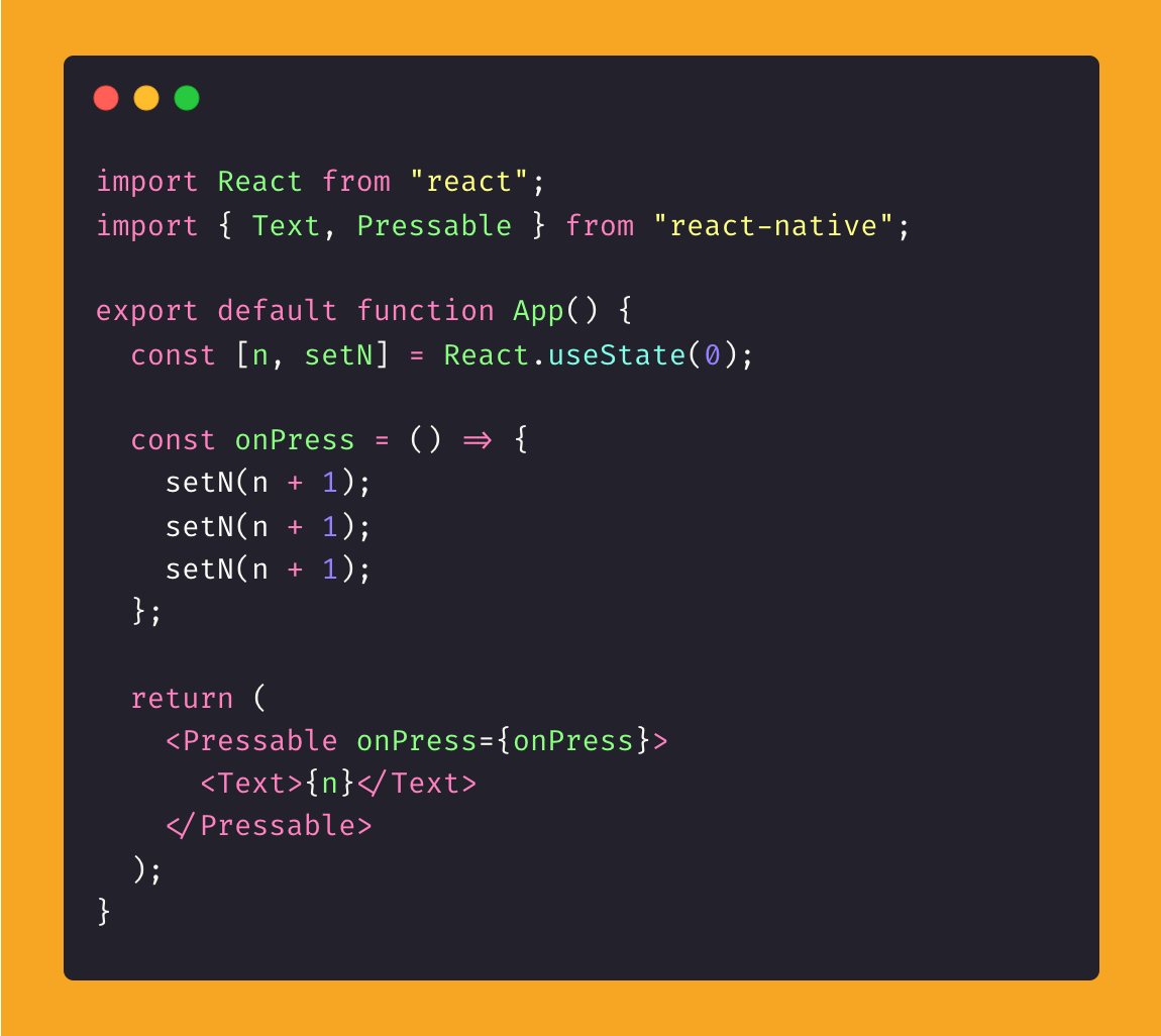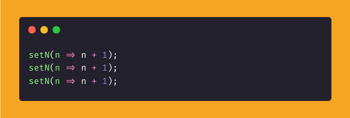 Answer: It shows 1. All three setN(n + 1) calls close over the same n (0), and React batches them. Then the “make it show 3” tweak: