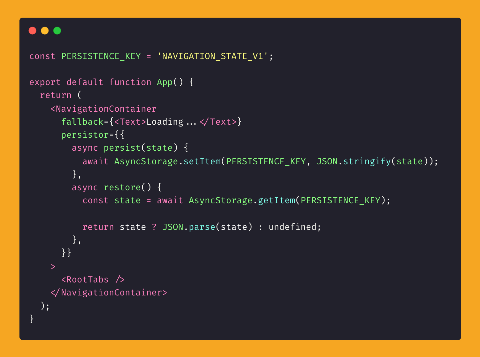 Lastly, there is now a new property on the NavigationContainer called “persistor”. Essentially, it allows you to define persist and restore functions to restore the navigator’s state even after the app has been terminated.