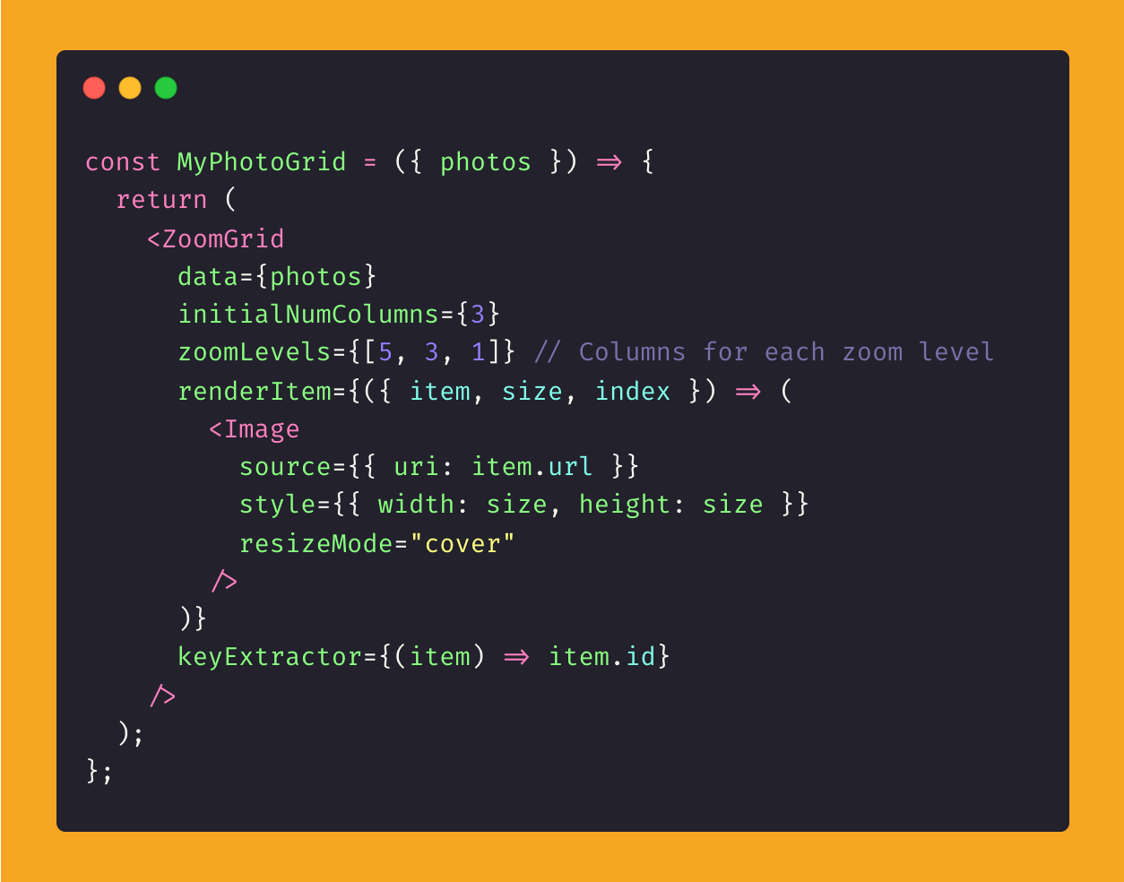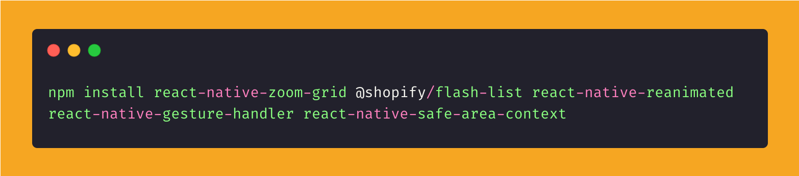 Well, as the saying goes: if you can’t do it yourself, pull in someone else’s third-party library. React Native Zoom Grid by @wassgha takes care of all your zooming woes. It’s built on top of Shopify’s powerful FlashList.