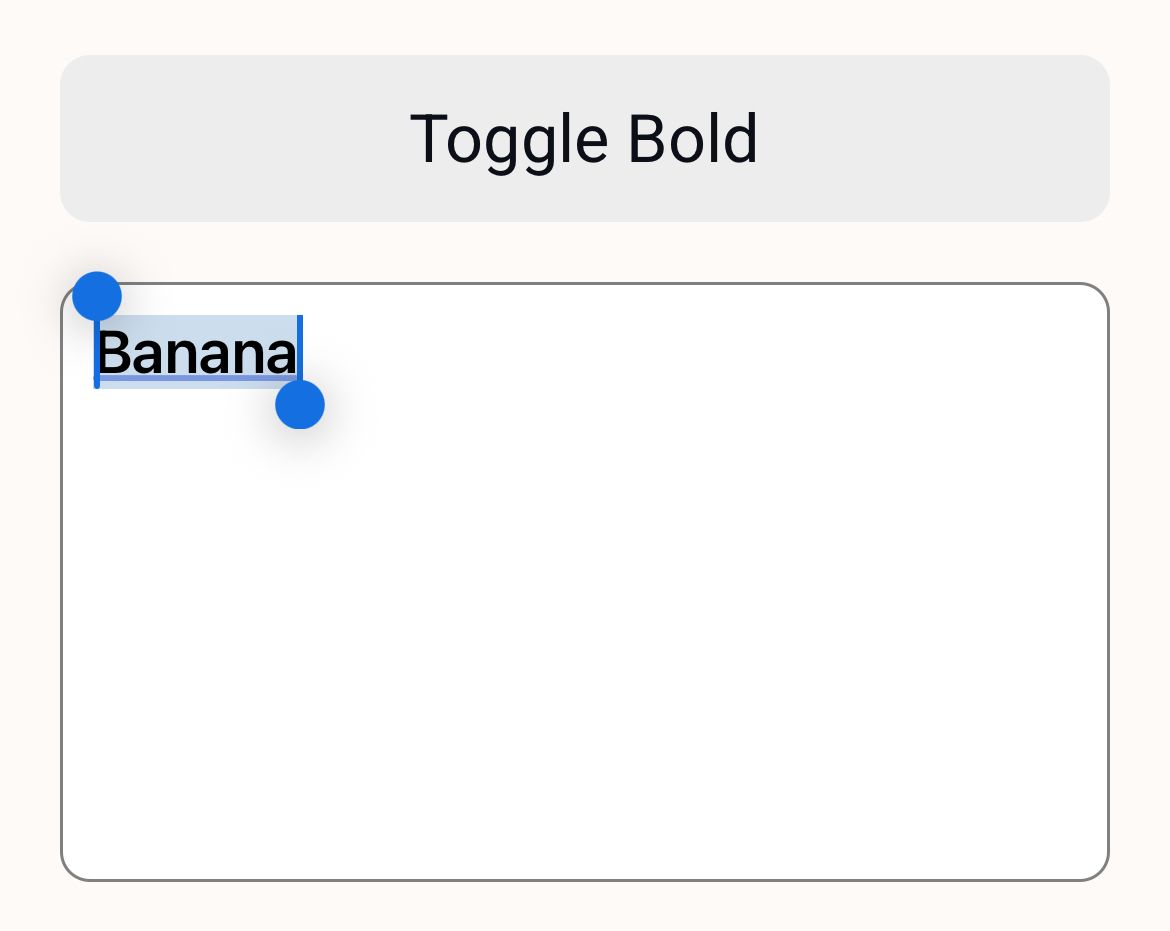 const ref = useRef<EnrichedTextInputInstance>(null); const [stylesState, setStylesState] = useState<OnChangeStateEvent | null>(null); return ( <View style={styles.container}> <EnrichedTextInput ref={ref} onChangeState={(e) => setStylesState(e.nativeEvent)} style={styles.input} /> <Button title="Toggle bold" color={stylesState?.isBold ? 'green' : 'gray'} onPress={() => ref.current?.toggleBold()} /> </View> );