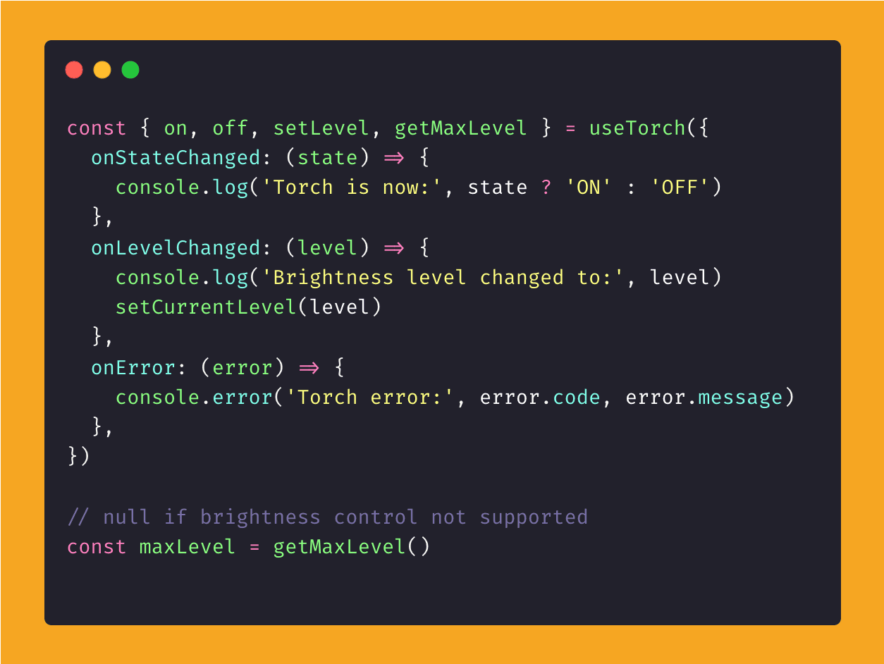 React Native Nitro Torch gives you real-time torch control with zero lag. It ships as a hook, with proper TypeScript support, native brightness control (iOS and Android 13+), and state tracking out of the box.