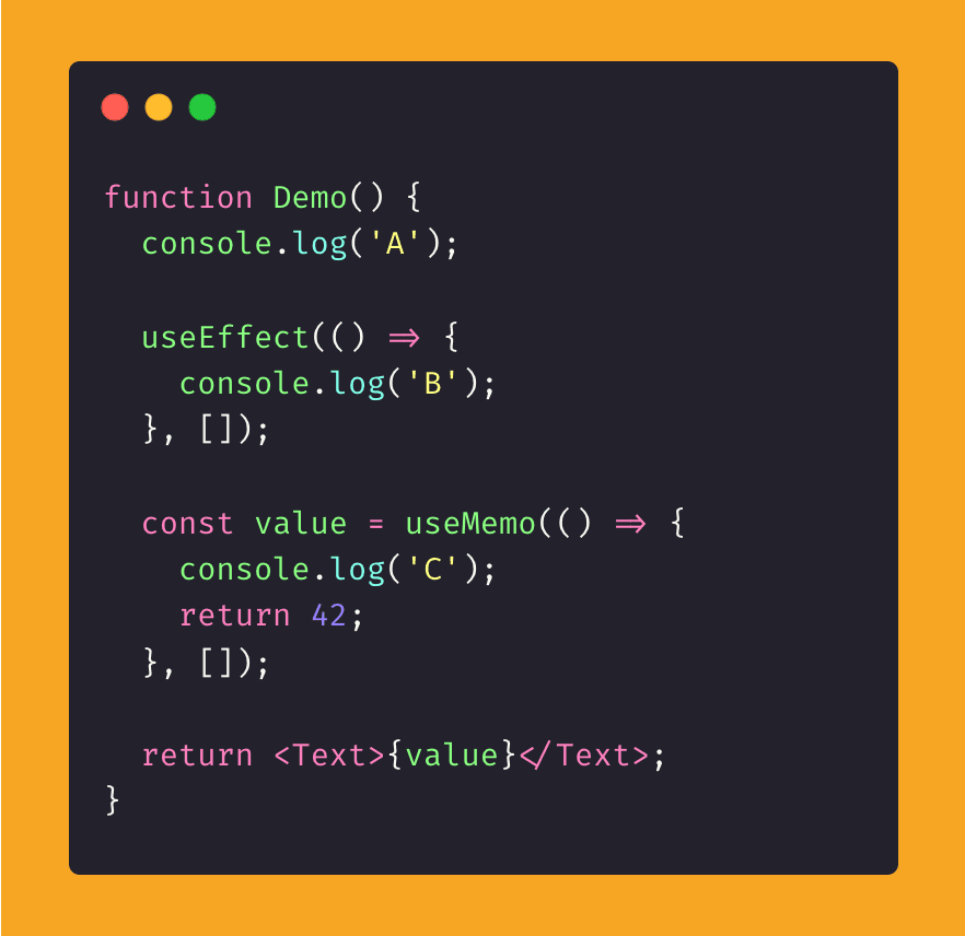 The Code Challenge: The answer is A, C, B — because useMemo runs synchronously during render, while useEffect waits until after the DOM paints.