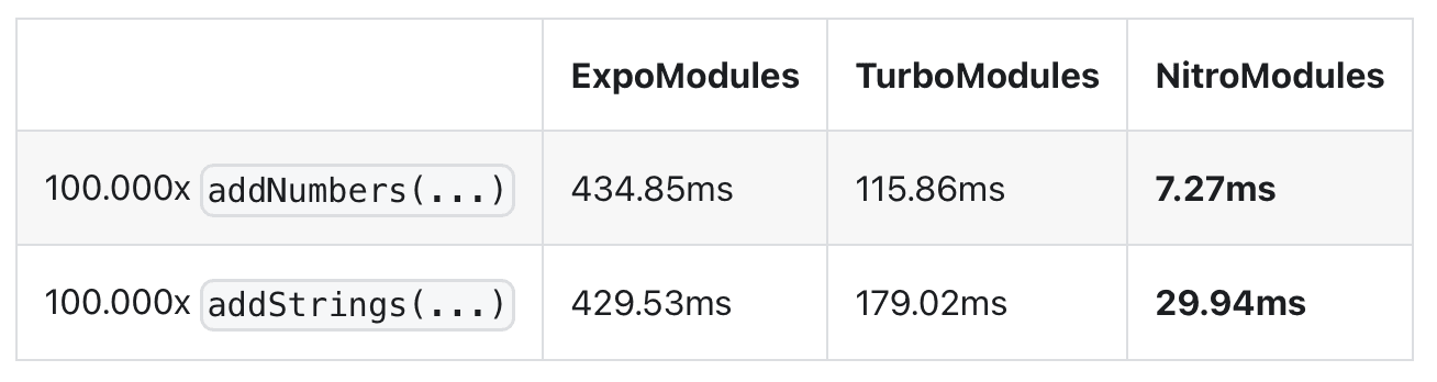 jsi::Personally, I am very excited about this library. Not only is the performance 10x better than its counterpart TurboModules (React Native’s native system built on the new architecture) and almost 100x better than ExpoModules: