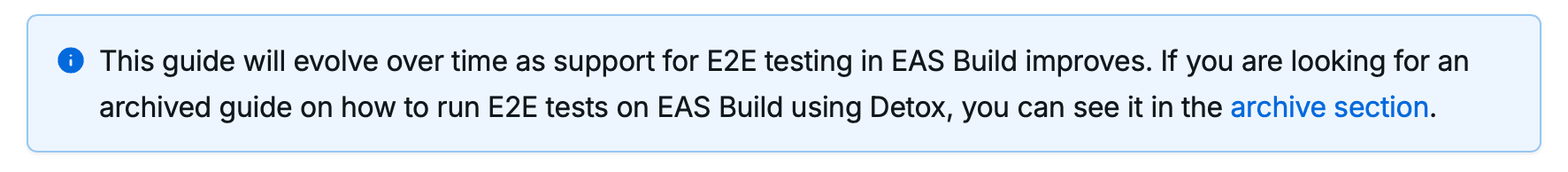 Expo silently archived their Detox test support documentation for EAS, their cloud service. Instead, they’ve shifted their focus to Maestro, a new (I’ve never heard of it) testing tool that’s shaping up to be the go-to solution for mobile testing automation. This shift represents a very different paradigm in how we approach end-to-end (E2E) testing. These impressions are largely based on the silent archiving of the Detox documentation, as no official statements have been made regarding the change.