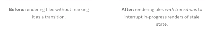 import {startTransition} from 'react'; // Urgent: Show the slider value setCount(input); // Mark any state updates inside as transitions startTransition(() => { // Transition: Show the results setNumberOfTiles(input); })
